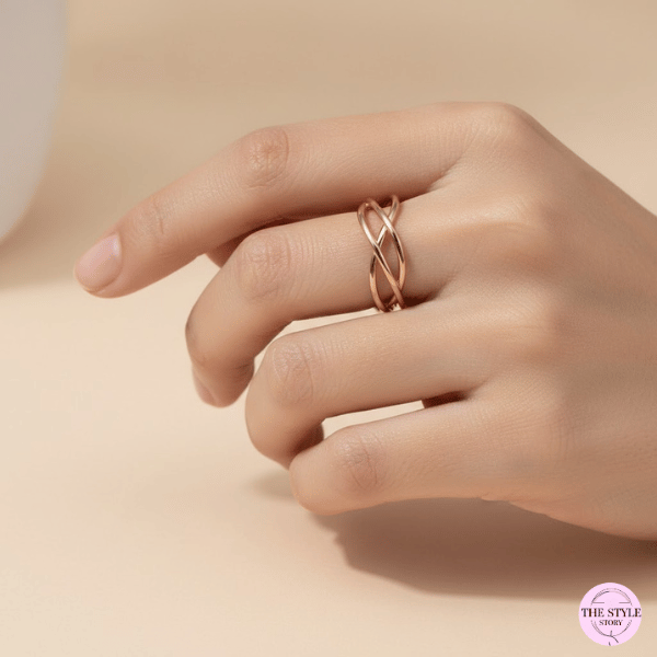 Finished in a polished rose-gold tone, the layered structure feels lightweight yet visually striking. The open adjustable design ensures a comfortable fit, making it easy to wear all day without compromise.
